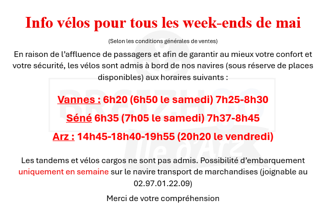 Sont interdits à bord toute l’année : Vélos+remorque, tandem et vélos cargo. (ces derniers peuvent toutefois être embarqués de Séné via la barge de transport (réservation obligatoire au 02 97 01 22 09)